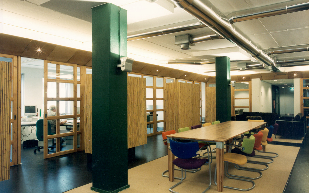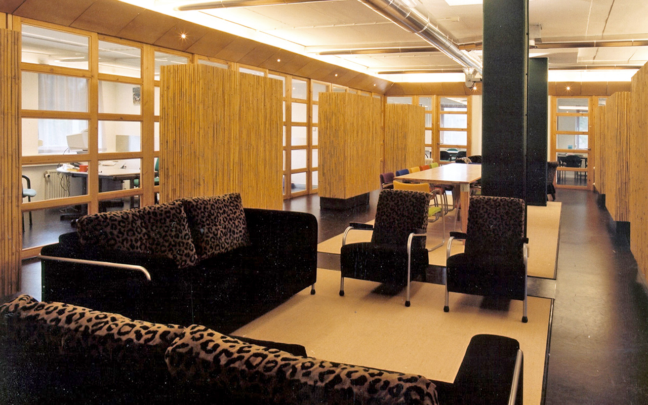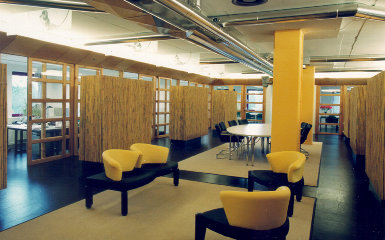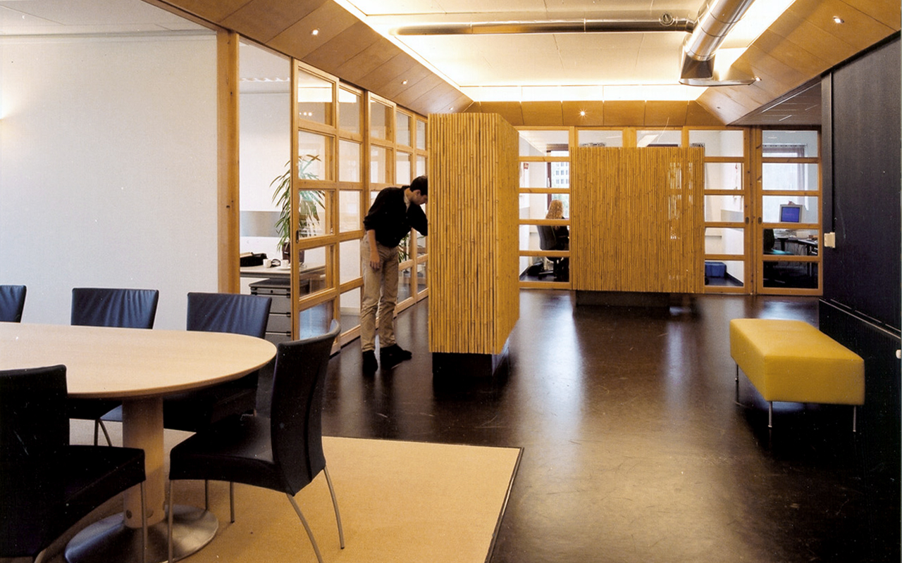 To start with, the existing interior was totally stripped inclusive of all suspended ceilings. An entirely new arrangement of space culminated in individual workplaces along the facades, make room for open collective space for discussion, having a meeting or just to relax (living room concept). The ‘in between’ space is intended for cupboards and machines, whereby the existing old cupboards were cladded with bamboo screens for reasons of privacy and acoustics.