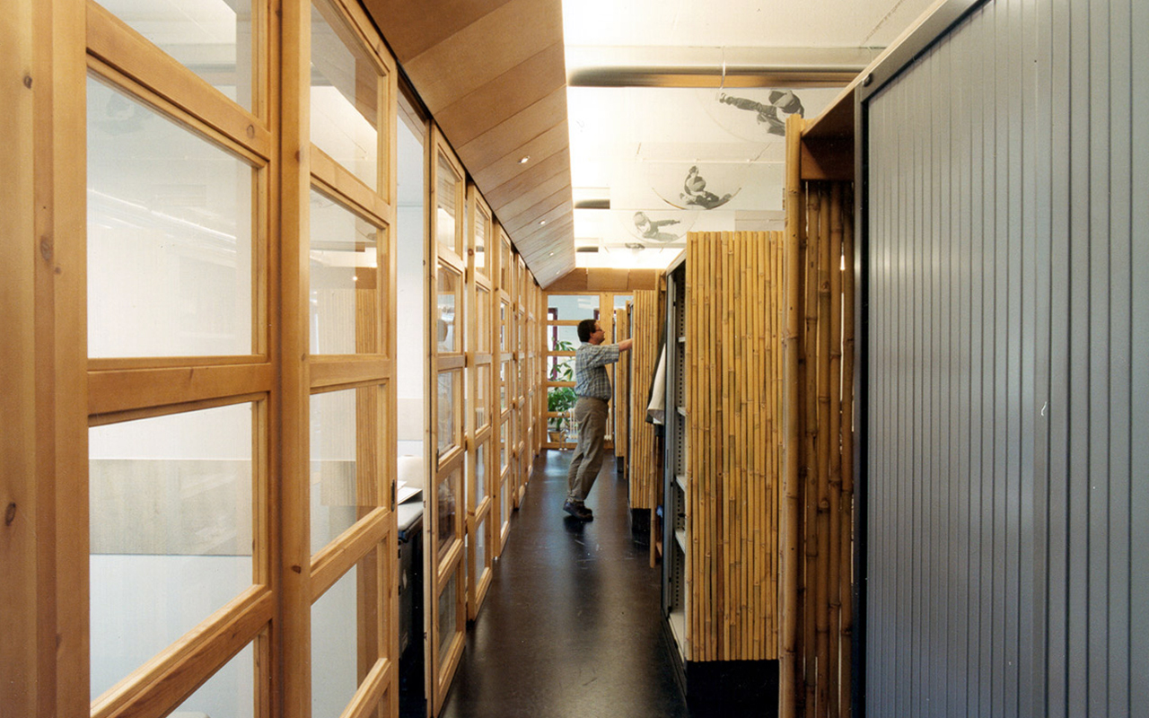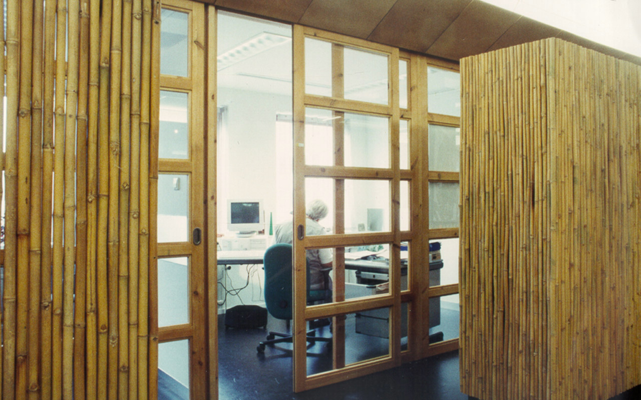 The new layout enhances the solidarity of the employees. By taking out the old suspended ceilings spatial quality is intensified. The individual workplaces are segregated from the communal space by a floor to ceiling glazed timber sliding panels. The bamboo screens improve the acoustics in such a way that they attenuate the noise coming from the collective space in the middle.