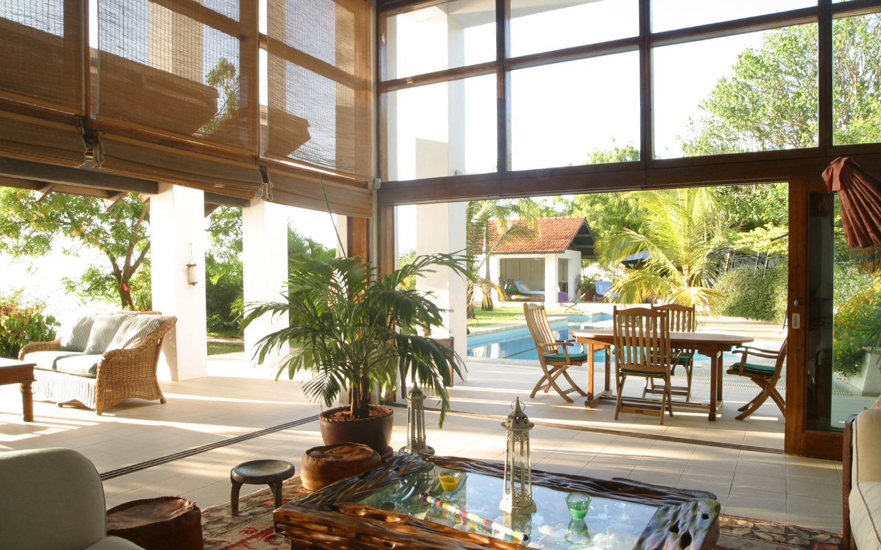 The main structure of the house is built up by concrete cast on site, filled with cement blocks to shape the walls in between. The dark timber frames with a transparent finish contrast nicely with the white plasterwork of the exterior walls. The soft coloured floor tiles both within and without connect house and garden in a natural way.