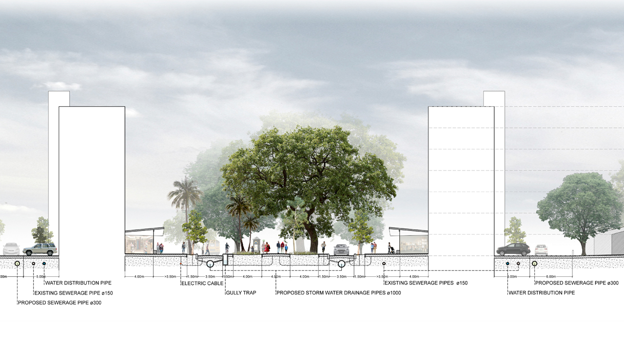 Open space and green form the quintessence of the plan. Through the use of various indigenous tree and plant species, distinctions are made between the streets and walkway. The trees and shading, together with improved pavements, street lighting and -furniture, optimizing drainage and creating activities in and along the open spaces will secure an attractive pedestrian realm in the city centre of Zanzibar.