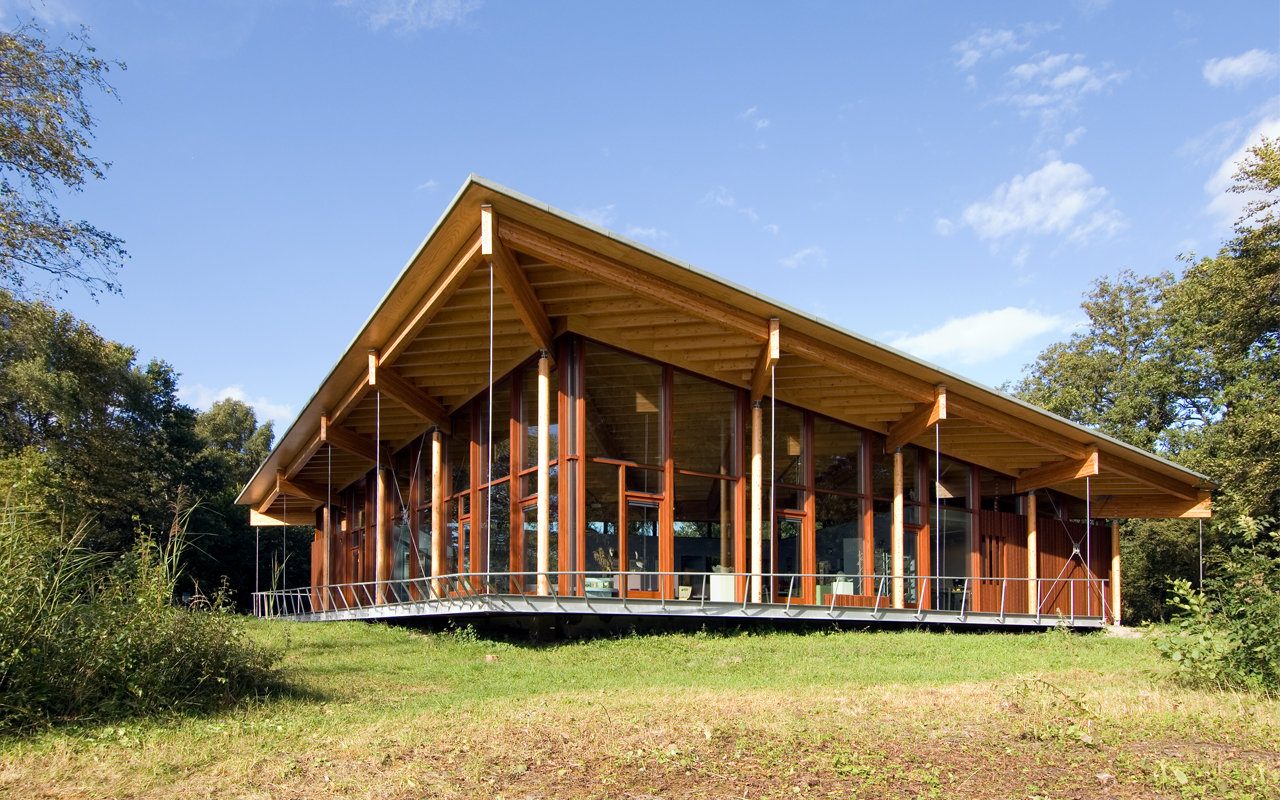 From the inside, the timber structure of the building is kept visible like the skeleton of a whale. The program provides for exhibition space, meetings, offices, kitchen and workshop. With the floating veranda and the toppling of the roof a dynamic building emerges, with a different face on all sides.
