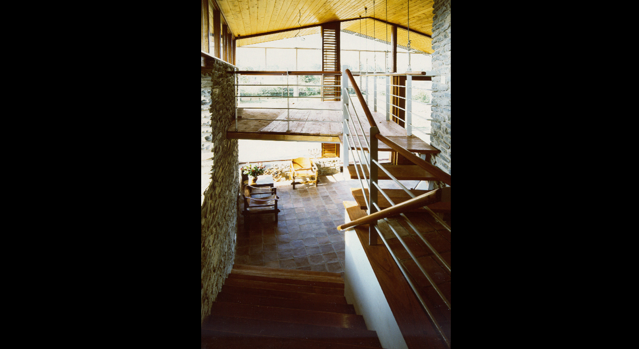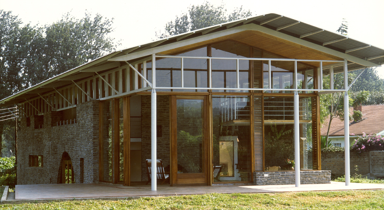 The arch shape of the main entrance of the house is in deep contrast with the abstract details of the rest and thus put things in perspective. The living room of the house, which is double in height as compared to the other rooms, has a splendid view towards the mount Meru. The entresol in the living room is suspended form the steel roof structure.